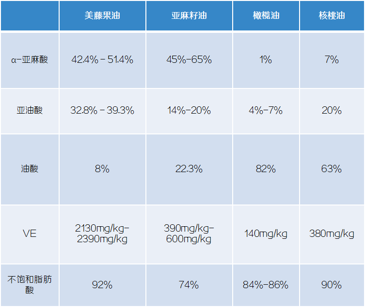 美藤果油相對于其他植物油的優(yōu)勢:美藤果油不飽和脂肪酸高達92%,其中人體必需脂肪酸α-亞麻酸和亞油酸含量高于其他油脂,活性物質(zhì)生育酚(VE)含量遠大于亞麻籽油。