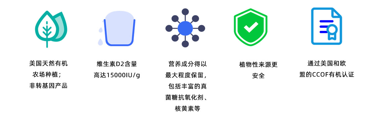 本品原料選用從美國Monterey Mushrooms®(蒙特利) 白蘑菇粉提取的天然維生素D。