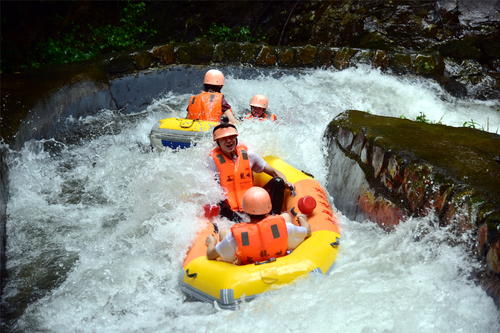 接下來是驚險刺激的漂流了!被譽為“浪尖上的過山車”的古龍峽漂流,有著全國最大的漂流落差、最刺激的漂流體驗。參加了漂流活動的帥哥美女們游玩云天玻霸后,迫不及待地下山,一到漂流地點,就歡呼雀躍地穿上救生衣和頭盔,縱身跳上橡皮艇,隨著清流激湍一路漂游而下,體驗一把過山車般的刺激快感!